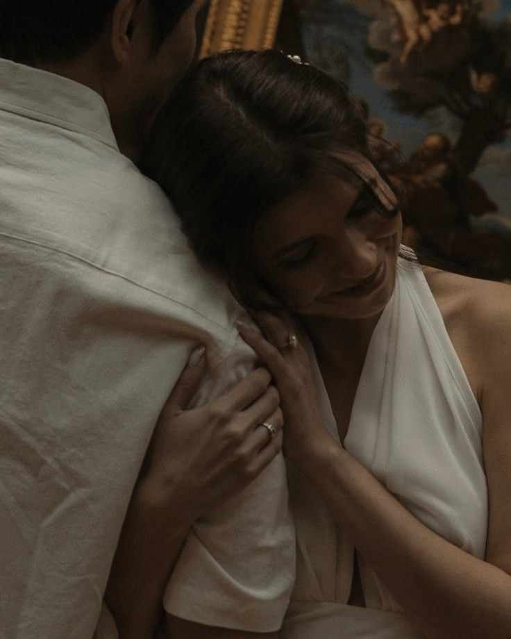 Kabir slowly lifts her left hand toward his lips. Before kissing it, he closes his eyes and respectfully touches her hand to his own eyes, as if seeking a silent blessing. Then, with utmost tenderness, he places a gentle kiss on her engagement ring.